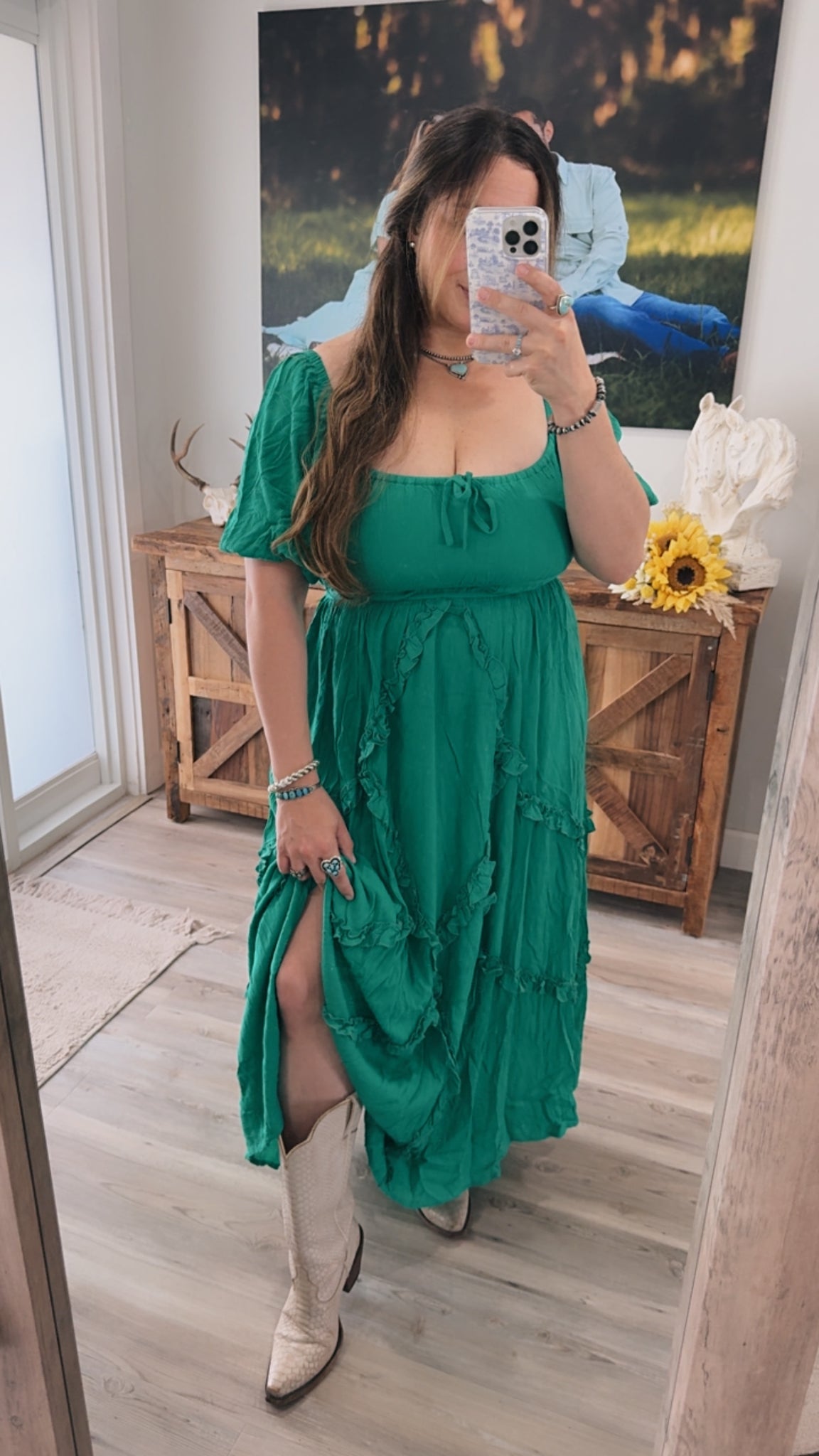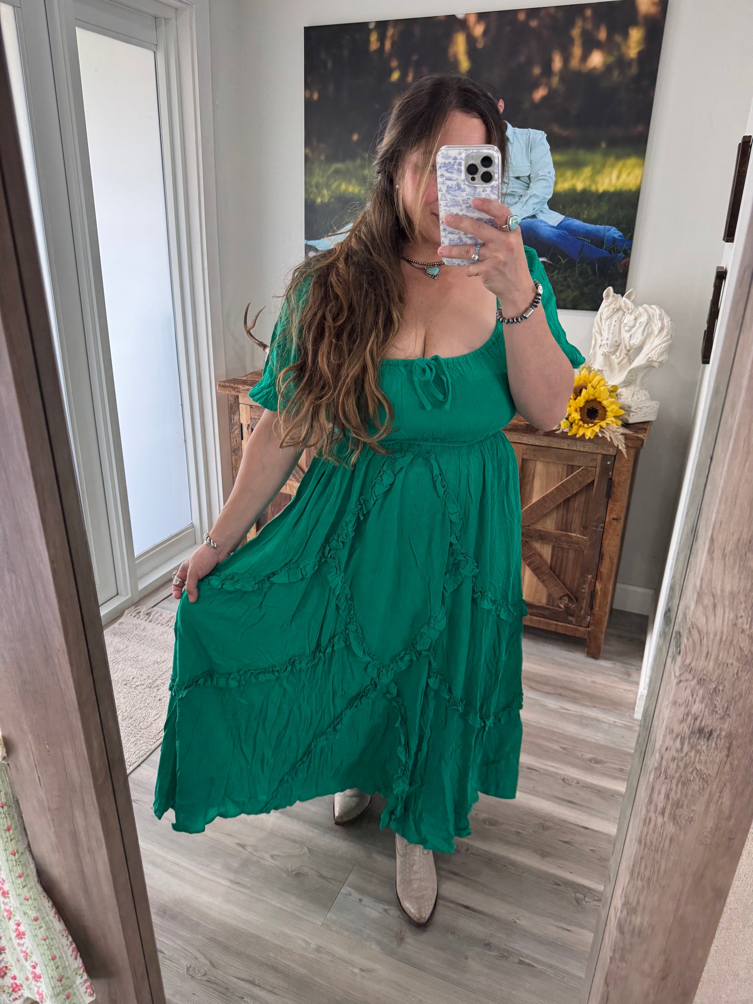 This dress is perfect for the season!! The color doesn’t do justice in this photo it’s a beautiful emerald vibrant geek. It does have stretch on the smocked pack. I’m wearing a MEDIUM in the photo and I’m usually a large! I would definitely recommend wearing true to size if you’re bigger in the bust!! I would stick to my true large on this one for more room at the bust. If you’re smaller at the bust you could definitely size down. I’m usually a large, wearing a medium, and I’m 5’3! Gorgeous spring maxi!